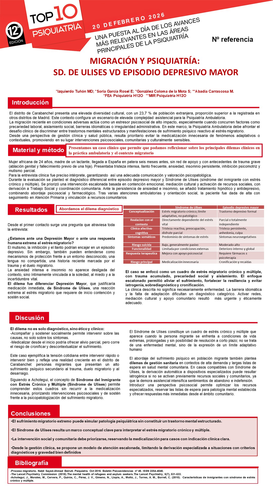 Usted va a votar como Mejor póster informativo: "Migración y Psiquiatría: Síndrome de Ulises vs. Depresión Mayor. A propósito de un caso ambulatorio".
