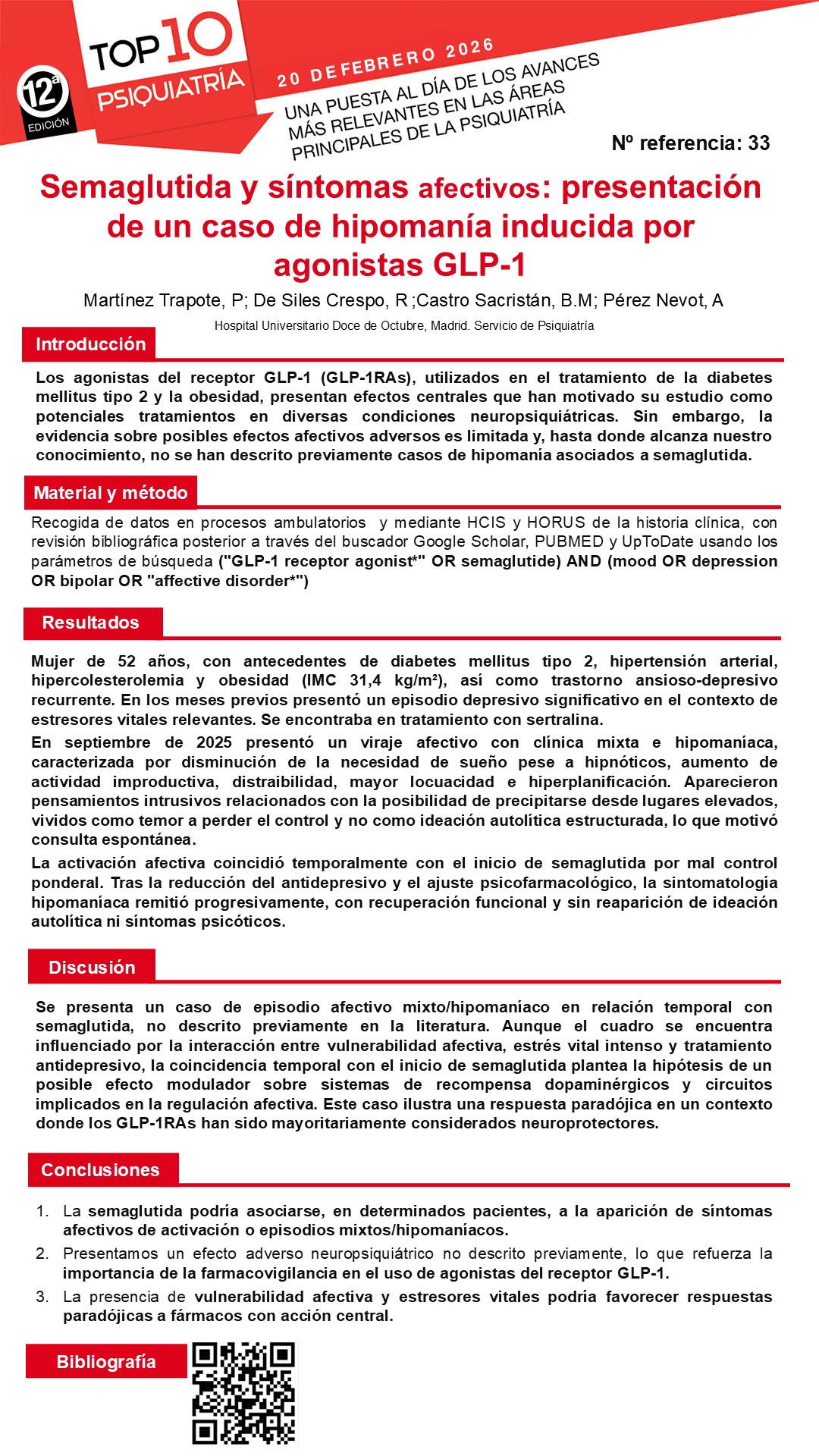 Usted va a votar como Mejor póster informativo: "Semaglutida y síntomas afectivos: presentación de un caso de hipomanía inducida por agonistas GLP-1.".