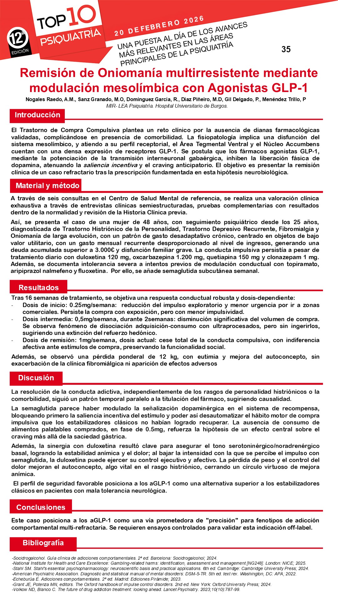 Usted va a votar como Mejor póster informativo: "Remisión de Oniomanía multirresistente mediante modulación mesolímbica con Agonistas GLP-1.".