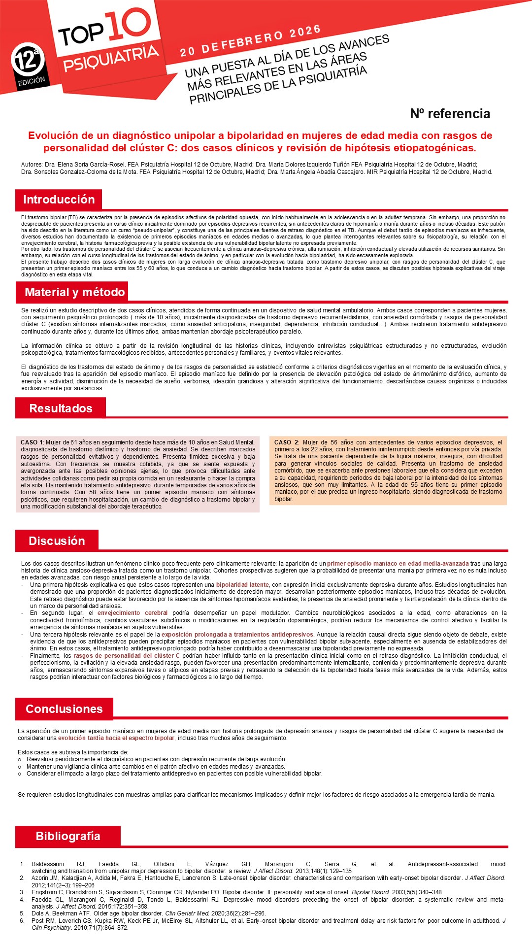 Usted va a votar como Mejor póster informativo: "Evolución de un diagnóstico unipolar a bipolaridad en mujeres de edad media con rasgos de personalidad del Cluster C: dos casos clínicos y revisión de hipótesis etiopatogénicas.".